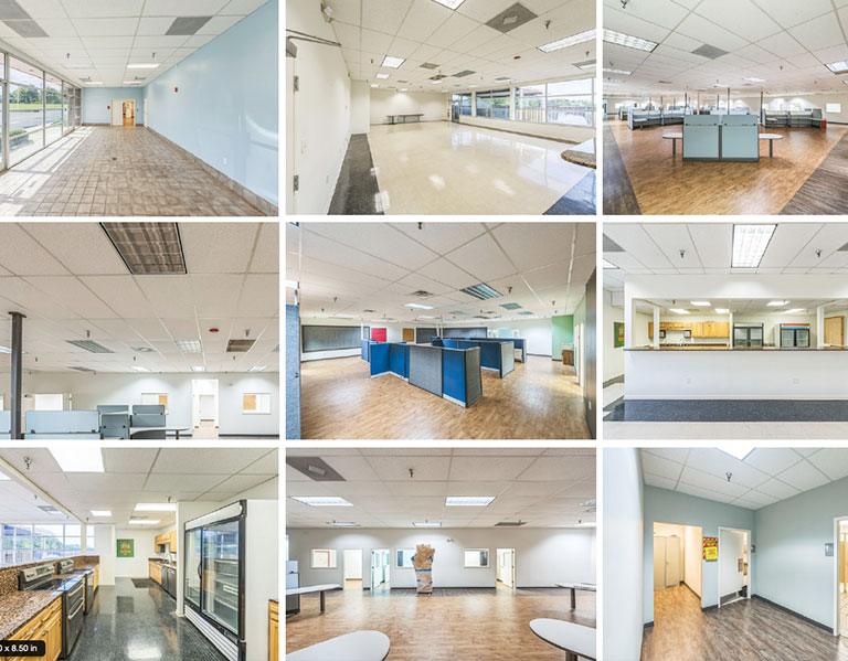 Large break room with commercial-grade appliances, prep area, seating for 60+, and a fenced outdoor patio